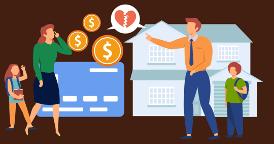 A woman, child, man, and child are near a house. Money and a broken heart are shown.